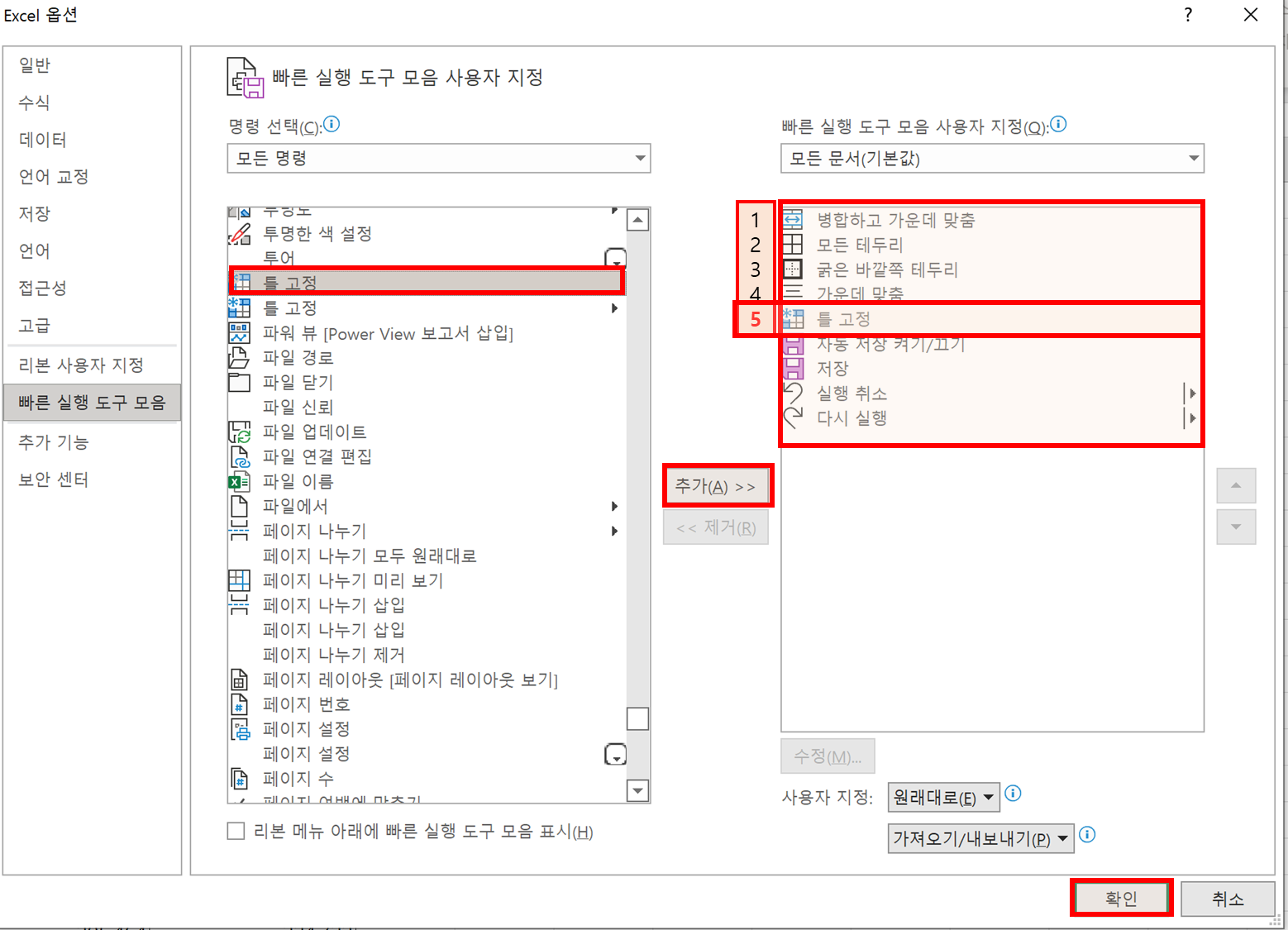 기본 적으로 틀 고정의 단축키는 네 번 이상의 키보드를 눌러야 하는데요. 빠른 실행 도구에 틀 고정을 설정해 두면 단 두 번의 키보드로 틀 고정 및 취소를 할 수 있습니다.