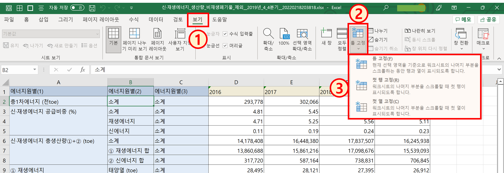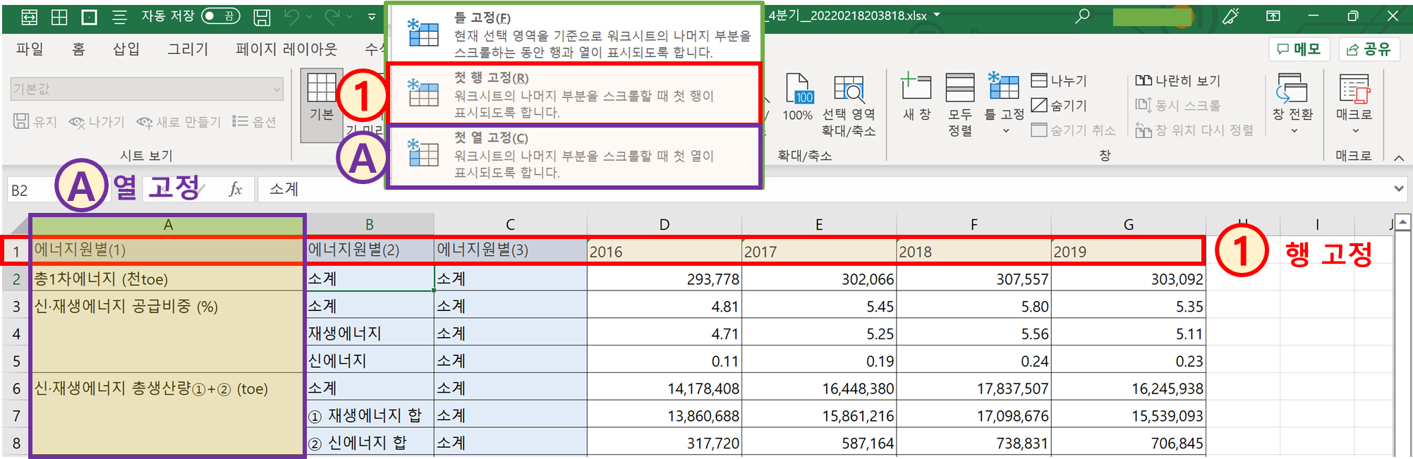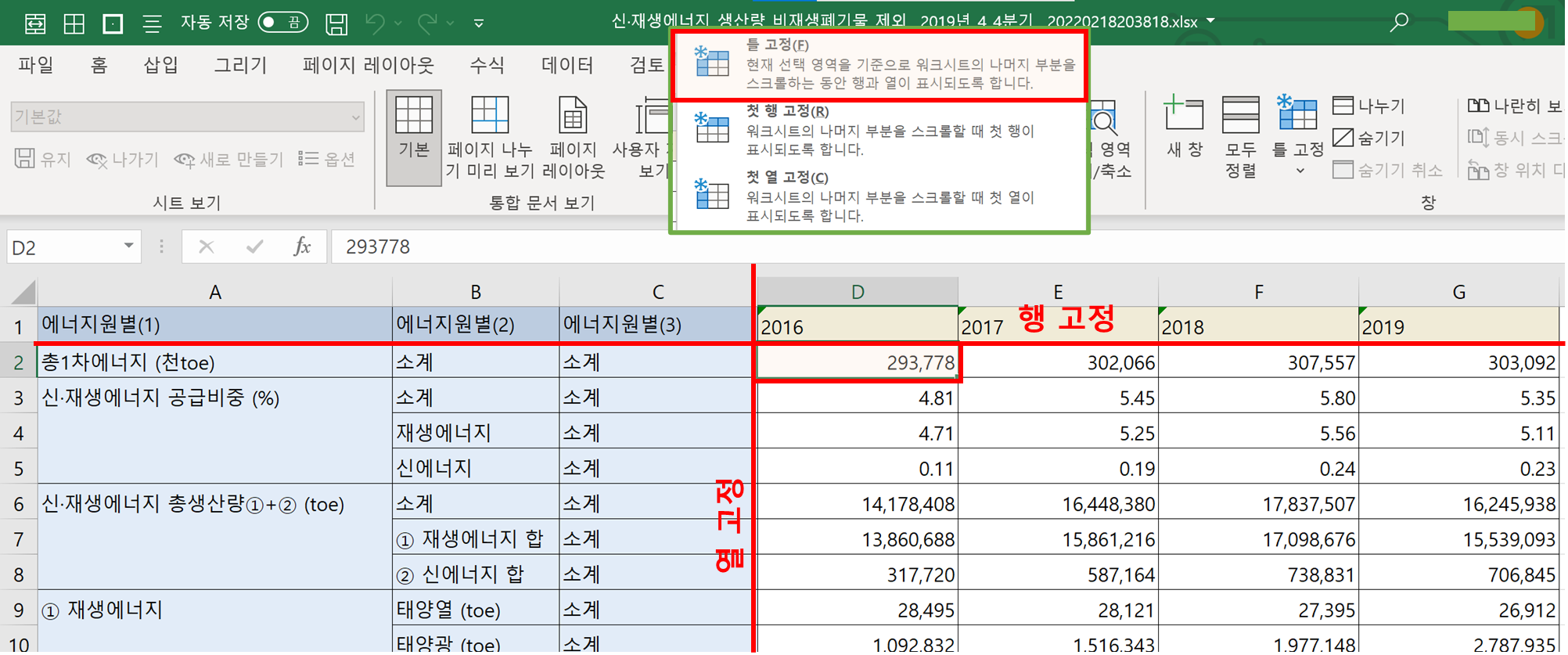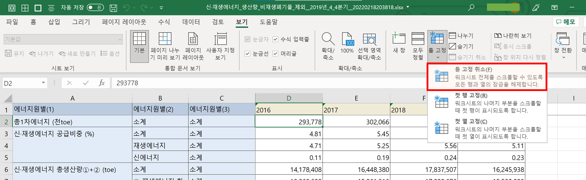 틀 고정이 된 상태에서 "틀 고정" 메뉴를 다시 클릭해 보면 "틀 고정 취소"를 보실 수 있습니다.