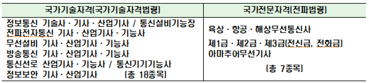 검정시행 종목은 국가기술자격법령에 따른 국가기술자격법령 총 18 종목, 전파법령에 따른 국가전문자격 총 7 종목으로 구성되어 있습니다.