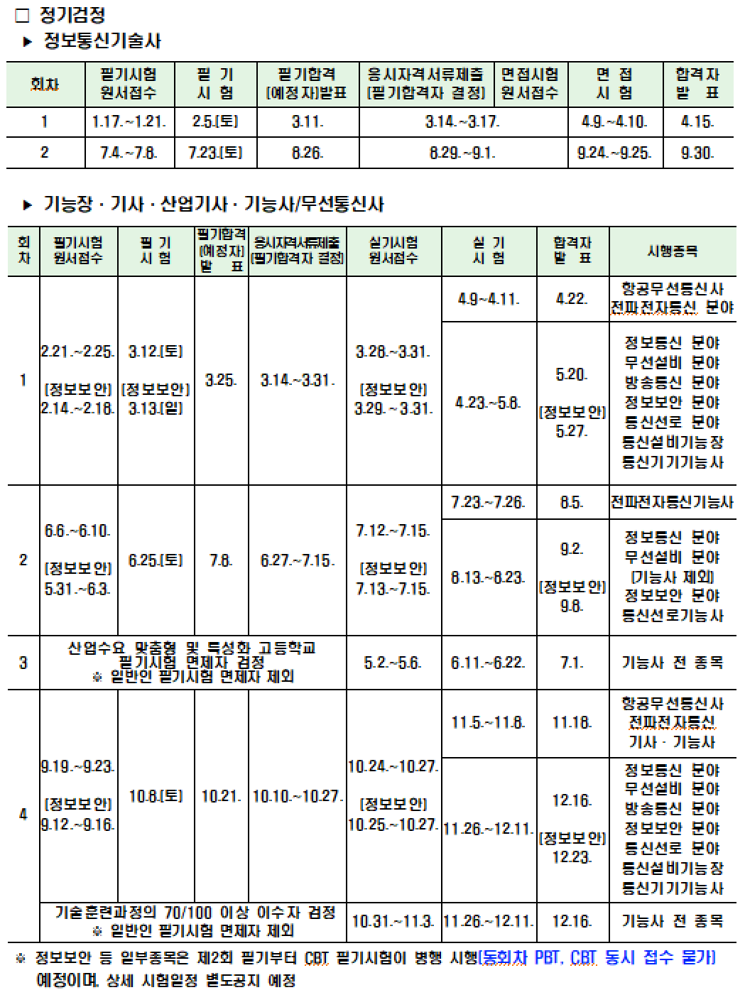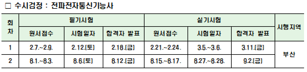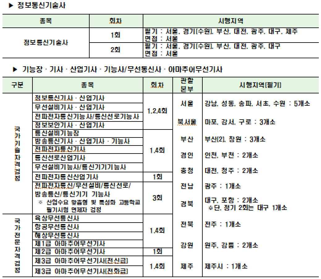 검정시행 일정은 정기 검정 및 수시검정으로 구성됩니다. 정기점정 일정은 자격증 별로 정보통신기술사의 경우 2회, 기능장, 기사, 산업기사, 기능사 및 무선통신사는 4회 검정이 이루어집니다. 그리고 전파전자통신기능사만 수시검정 일정 2회가 예정되어 있습니다. 수시검정은 부산에서만 시행하니 꼭 기억해주세요~!
